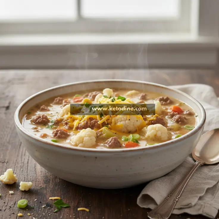 This Keto Cauliflower & Hamburger Soup is the ultimate comfort food with a low-carb twist. Rich, creamy, and deeply satisfying, it combines tender cauliflower florets with juicy seasoned ground beef in a warm, savory broth. Every spoonful delivers cozy flavors, a velvety texture, and that classic homemade soup feeling—without the carb overload. Perfect for keto, low-carb, and gluten-free lifestyles, this soup is hearty enough to keep you full and happy.