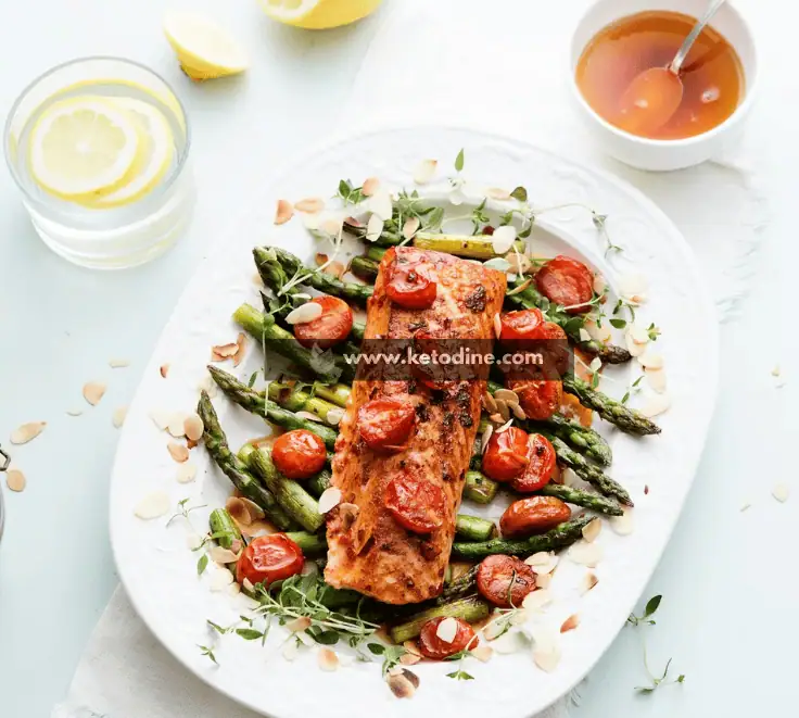 It’s a high-protein, low-carb dish featuring salmon seasoned with chili, roasted alongside fresh asparagus and cherry tomatoes. The combination creates a balanced keto-friendly meal that’s rich in omega-3 fats, antioxidants, and fiber—perfect for weight management and clean eating.