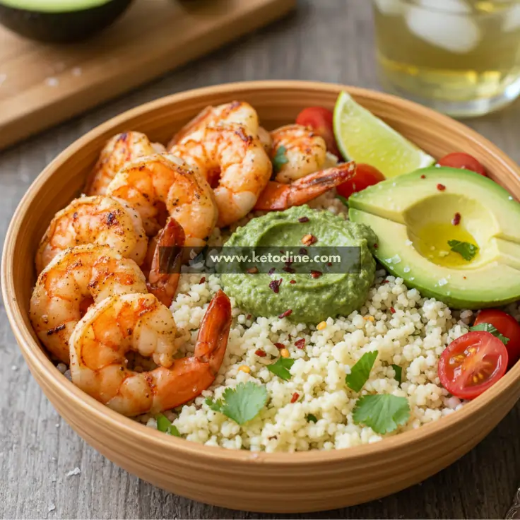 It’s a modern low-carb bowl-style meal inspired by fresh coastal and Mediterranean flavors. Grilled shrimp are paired with creamy avocado and served over seasoned cauliflower rice, making it a keto adaptation of classic shrimp rice bowls.