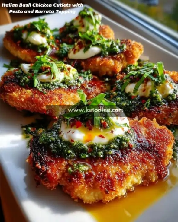 This dish is an Italian-inspired chicken recipe featuring thin chicken cutlets, lightly coated and pan-fried until crisp, then finished with fresh basil pesto and creamy burrata. It blends classic Italian flavors with a modern low-carb twist.