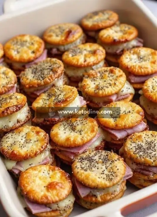 A delicious keto-friendly appetizer that combines the buttery crunch of almond flour crackers with savory ham and melted cheese. Topped with a signature poppyseed butter glaze, these mini sandwiches are baked until the flavors meld into a warm, comforting treat.