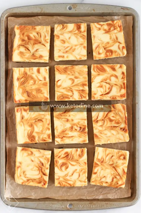 They are low-carb, sugar-free cheesecake bars baked in a sheet pan, topped with a salted caramel swirl. Once cooled, they’re cut into small bite-sized squares—perfect for portion-controlled keto dessert snacking.