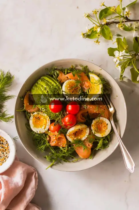 It’s a nutrient-dense, low-carb salad featuring smoked salmon, creamy avocado, soft-boiled eggs, arugula, and fresh herbs—all tossed together to create a balanced, keto-friendly meal that’s ready in minutes.