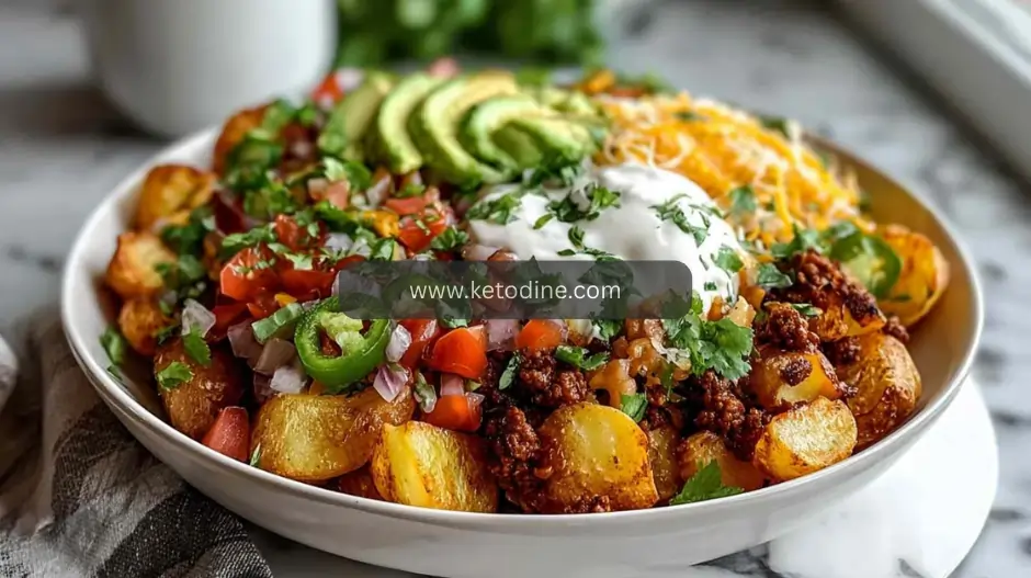 Warm, cozy, and bursting with bold Tex-Mex flavors, this Loaded Potato Taco Bowl is pure comfort in a bowl. Crispy golden potatoes meet savory spiced meat, fresh toppings, and creamy finishes for the perfect balance of crunch, creaminess, and spice. It’s a crowd-pleasing, customizable meal that feels indulgent while still fitting a low-carb, keto-aware lifestyle when prepared thoughtfully.