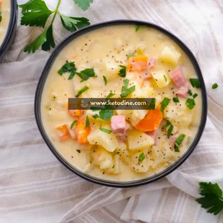A hearty, keto-compliant chowder that swaps potatoes for cauliflower, slow-cooked to perfection with smoky ham and rich cream.
