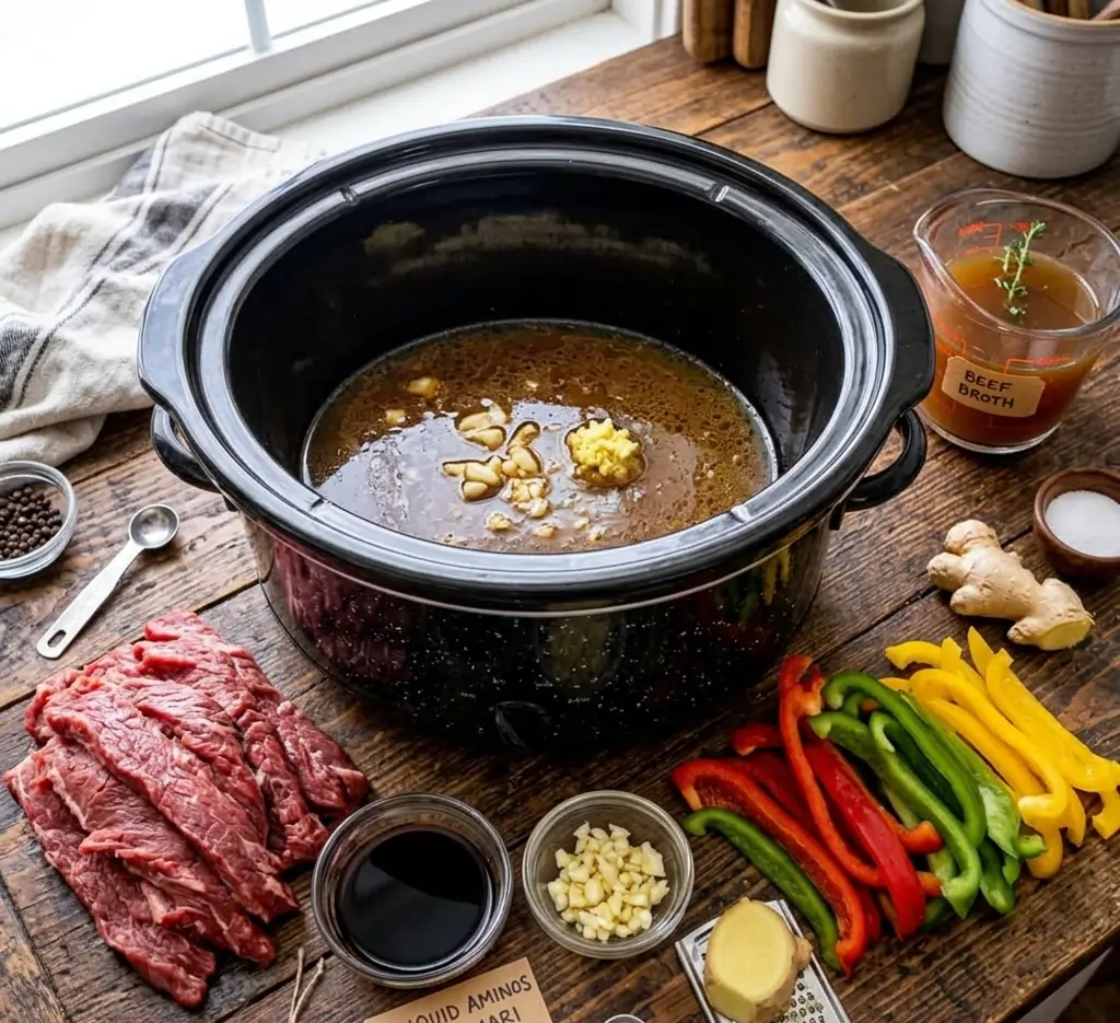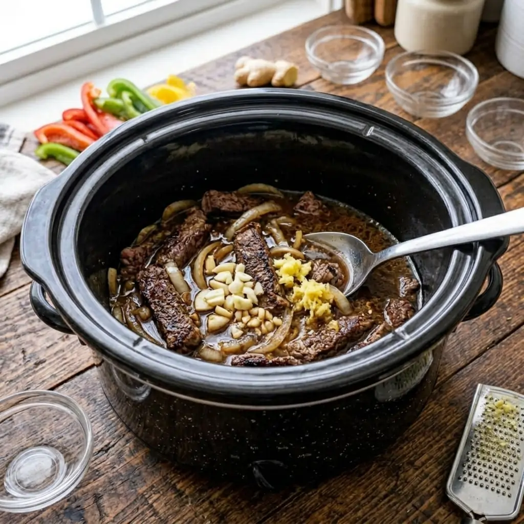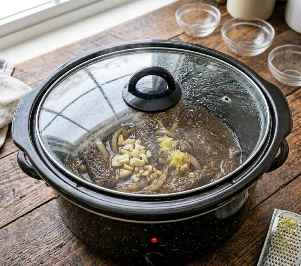 Slow Cooker Prep: Place the seared beef, onions, garlic, ginger, beef broth, and liquid aminos into the crockpot.