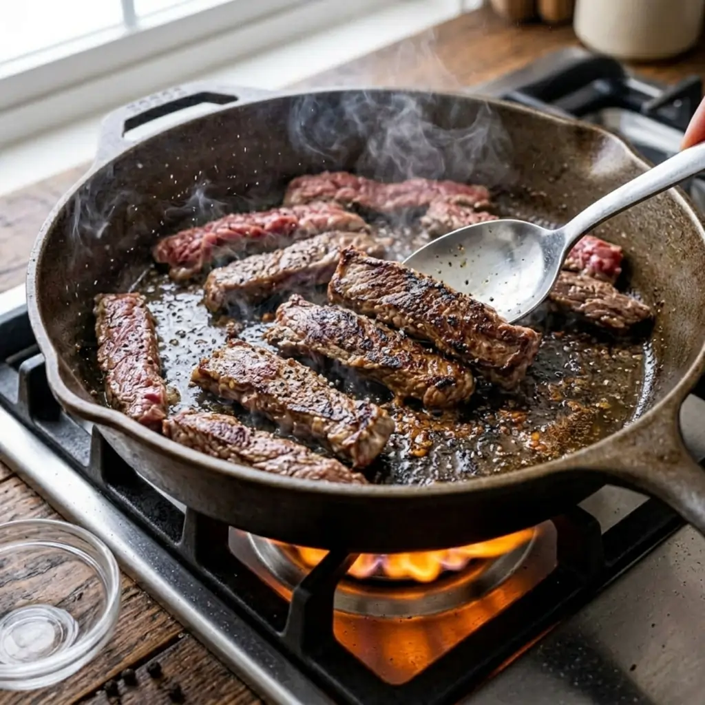 Sear the Beef: Heat oil in a skillet over medium-high heat. Season beef with salt and pepper, then sear in batches for 2 minutes per side until browned.